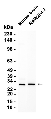 Western blot analysis of extracts from RAW264.7 cells and Mouse brain tissue using db14528 at 1:1000.