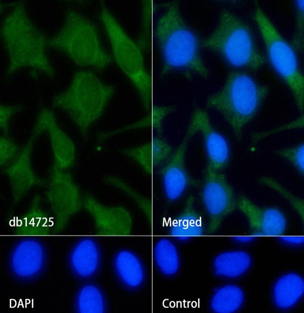 The cells were fixed with cold 100% methanol (10min, 4℃) and blocked in 1% BSA/10% normal goat serum/0.3M glycine in 0.1% PBS-Tween 20 for 1h. The cells were then incubate with db14725 (1:200) at room temprature for 1h, followed by a further incubation at room temperature for 45min with Goat Anti Rabbit lgG (H+L)-AF488 (