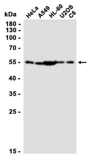 Western blot analysis of extracts from HeLa, A549, HL-60, U2OS, C6 cells using db14804 at 1:1000.