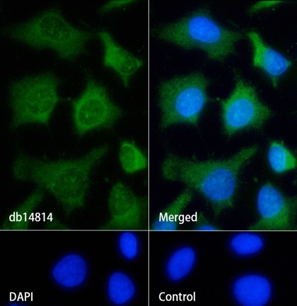 The cells were fixed with cold 100% methanol (10min, 4℃) and blocked in 1% BSA/10% normal goat serum/0.3M glycine in 0.1% PBS-Tween 20 for 1h. The cells were then incubate with db14814 (1:100) at room temprature for 1h, followed by a further incubation at room temperature for 45min with Goat Anti Rabbit lgG (H+L)-AF488 (