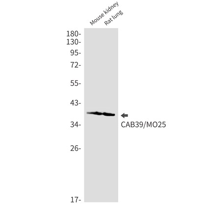 Western blot analysis of CAB39/MO25 in mouse kidney, rat lung lysates using CAB39 antibody(1:1000 diluted)