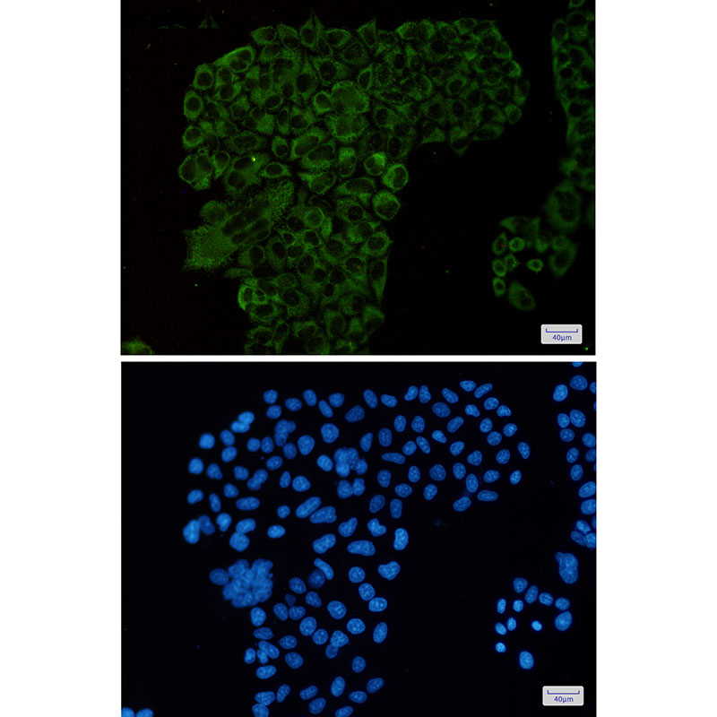 Immunofluorescent analysis of HeLa cells using db14815 antibody (green), and DAPI (blue).