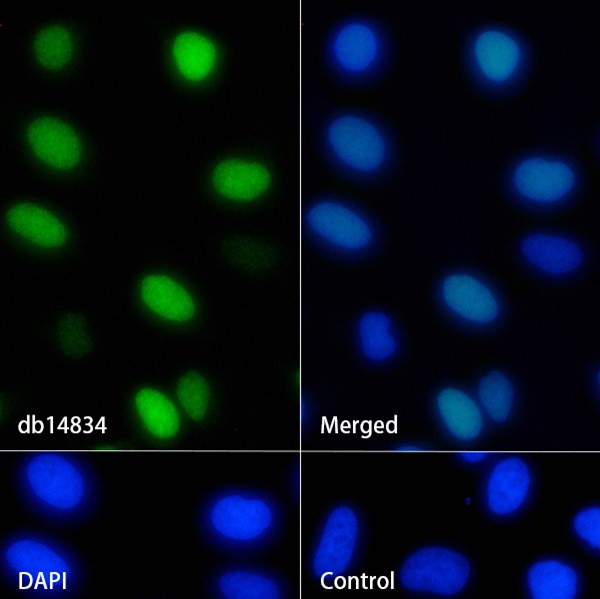 The cells were fixed with 4% PFA (10min, RT) followed by treatment with 0.1% Triton X-100 (10min, RT), and blocked in 1% BSA/10% normal goat serum/0.3M glycine in 0.1% PBS-Tween 20 for 1h. The cells were then incubate with db14834 (1:100) at room temprature for 1h, followed by a further incubation at room temperature for 45min with Goat Anti Rabbit lgG (H+L)-AF488 (