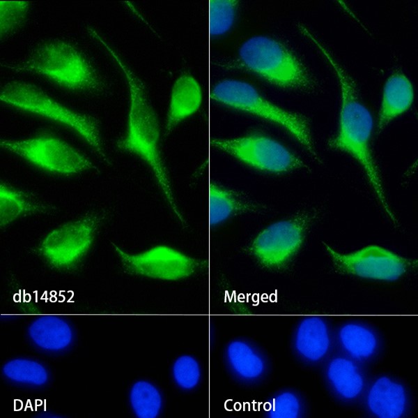The cells were fixed with 4% PFA (10min, RT) followed by treatment with 0.1% Triton X-100 (10min, RT), and blocked in 1% BSA/10% normal goat serum/0.3M glycine in 0.1% PBS-Tween 20 for 1h. The cells were then incubate with db14852 (1:100) at room temprature for 1h, followed by a further incubation at room temperature for 45min with Goat Anti Rabbit lgG (H+L)-AF488 (