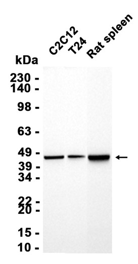 Western blot analysis of extracts from C2C12,T24 cells and Rat spleen tissue using db14858 at 1:1000.