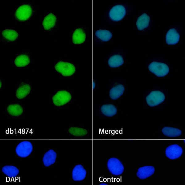 The cells were fixed with 4% PFA (10min, RT) followed by treatment with 0.1% Triton X-100 (10min, RT), and blocked in 1% BSA/10% normal goat serum/0.3M glycine in 0.1% PBS-Tween 20 for 1h. The cells were then incubate with db14874 (1:50) at room temprature for 1h, followed by a further incubation at room temperature for 45min with Goat Anti Rabbit lgG (H+L)-AF488 (