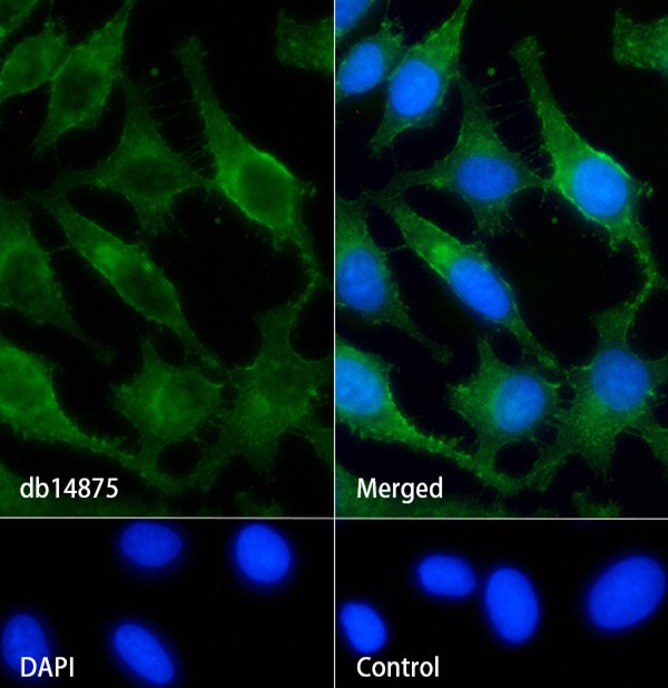 The cells were fixed with cold 100% methanol (10min, 4℃) and blocked in 1% BSA/10% normal goat serum/0.3M glycine in 0.1% PBS-Tween 20 for 1h. The cells were then incubate with db14875 (1:200) at room temprature for 1h, followed by a further incubation at room temperature for 45min with Goat Anti Rabbit lgG (H+L)-AF488 (