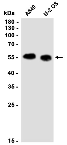 Western blot analysis of extracts from A549, U-2 OS cells using db14920 at 1:1000.