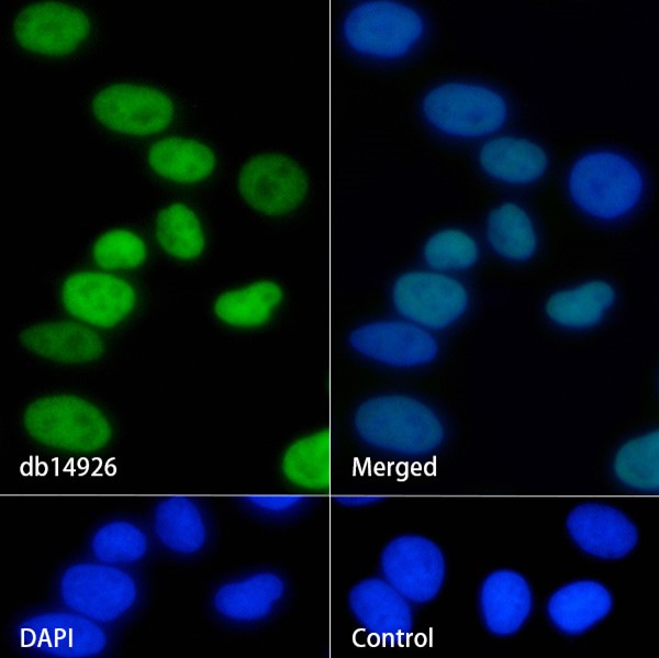 Immunofluorescent analysis of HeLa cells using db14926 antibody (green), and DAPI (blue).
