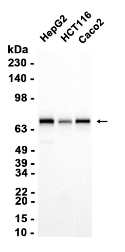Western blot analysis of extracts from HepG2,HCT116,Caco2 cells using db15130 at 1:1000.