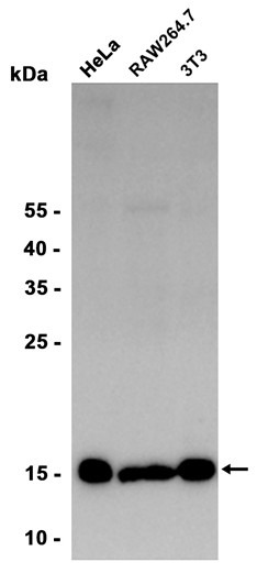 Western blot analysis of extracts from HeLa, RAW264.7, 3T3 cells using db15268 at 1:1000.