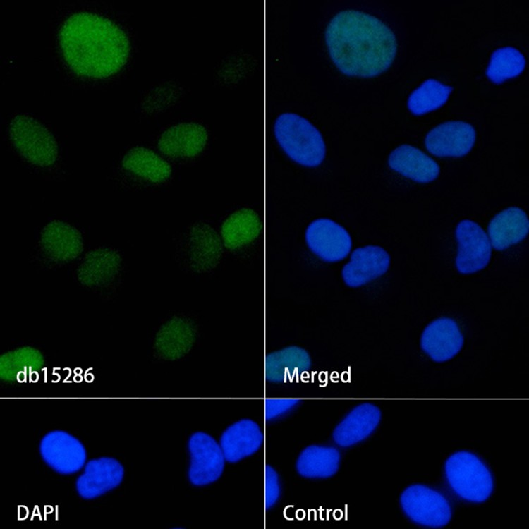 The cells were fixed with 4% PFA (10min, RT) followed by treatment with 0.1% Triton X-100 (10min, RT), and blocked in 1% BSA/10% normal goat serum/0.3M glycine in 0.1% PBS-Tween 20 for 1h. The cells were then incubate with db15286 (1:200) at room temprature for 1h, followed by a further incubation at room temperature for 45min with Goat Anti Rabbit lgG (H+L)-AF488 (