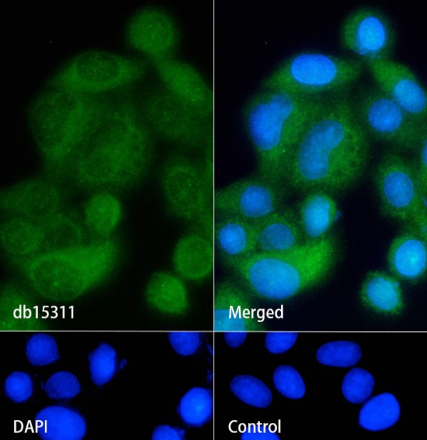 The cells were fixed with cold 100% methanol (10min, 4℃) and blocked in 1% BSA/10% normal goat serum/0.3M glycine in 0.1% PBS-Tween 20 for 1h. The cells were then incubate with db15311 (1:100) at room temprature for 1h, followed by a further incubation at room temperature for 45min with Goat Anti Rabbit lgG (H+L)-AF488 (