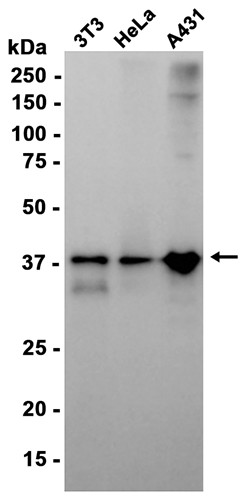 Western blot analysis of extracts from 3T3, HeLa, A431 cells using db15433 at 1:1000.