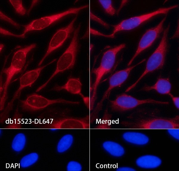 The cells were fixed with cold 100% methanol (10min, 4℃) and blocked in 1% BSA/10% normal goat serum/0.3M glycine in 0.1% PBS-Tween 20 for 1h. The cells were then incubate with db15523-DL647 (1:200,shown in red) at room temprature for 1h. Nuclear DNA was labeled in blue with DAPI.
