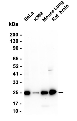 Western blot analysis of extracts from HeLa,K562 cells and Mouse lung,Rat brain tissue using db15723 at 1:500.