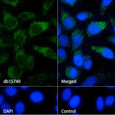 The cells were fixed with 4% PFA (10min, RT) followed by treatment with 0.1% Triton X-100 (10min, RT), and blocked in 1% BSA/10% normal goat serum/0.3M glycine in 0.1% PBS-Tween 20 for 1h. The cells were then incubate with db15740 (1:100) at room temprature for 1h, followed by a further incubation at room temperature for 45min with Goat Anti Rabbit lgG (H+L)-AF488 (