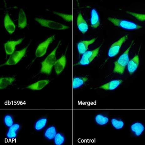 The cells were fixed with cold 100% methanol (10min, 4℃) and blocked in 1% BSA/10% normal goat serum/0.3M glycine in 0.1% PBS-Tween 20 for 1h. The cells were then incubate with db15964 (1:500) at room temprature for 1h, followed by a further incubation at room temperature for 45min with Goat Anti Rabbit lgG (H+L)-AF488 (