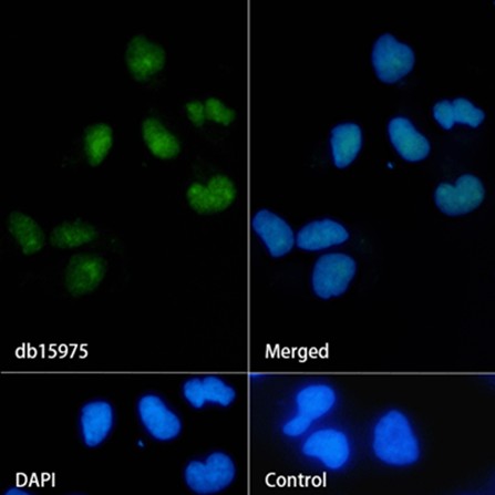 The cells were fixed with 4% PFA (10min, RT) followed by treatment with 0.1% Triton X-100 (10min, RT), and blocked in 1% BSA/10% normal goat serum/0.3M glycine in 0.1% PBS-Tween 20 for 1h. The cells were then incubate with db15975(1:500) at room temprature for 1h, followed by a further incubation at room temperature for 45min with Goat Anti Rabbit lgG (H+L)-AF488 (