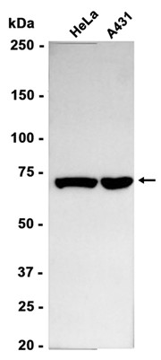 Western blot analysis of extracts from HeLa, A431 cells using db16041 at 1:1000.