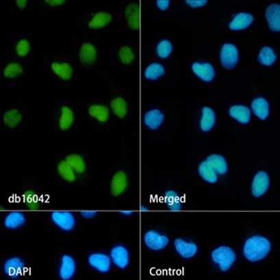 The cells were fixed with cold 100% methanol (10min, 4℃) and blocked in 1% BSA/10% normal goat serum/0.3M glycine in 0.1% PBS-Tween 20 for 1h. The cells were then incubate with db16042 (1:500) at room temprature for 1h, followed by a further incubation at room temperature for 45min with Goat Anti Rabbit lgG (H+L)-AF488 (