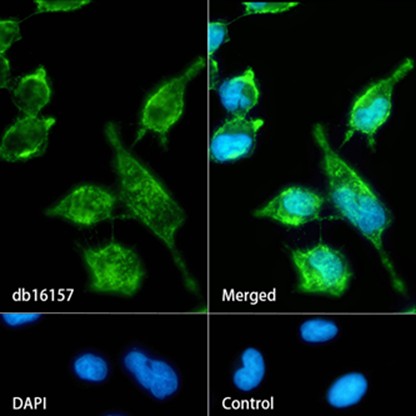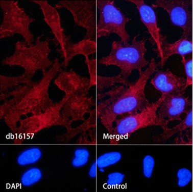 The cells were fixed with 4% PFA (10min, RT) followed by treatment with 0.1% Triton X-100 (10min, RT), and blocked in 1% BSA/10% normal goat serum/0.3M glycine in 0.1% PBS-Tween 20 for 1h. The cells were then incubate with db16157 (1:50) at room temprature for 1h, followed by a further incubation at room temperature for 45min with Goat Anti Rabbit lgG (H+L)-AF647(