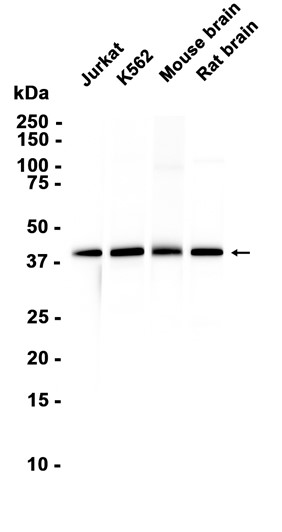 Western blot analysis of extracts from Jurkat, K562 cells and Mouse brain, Rat brain tissues using db16264 at 1:1000.