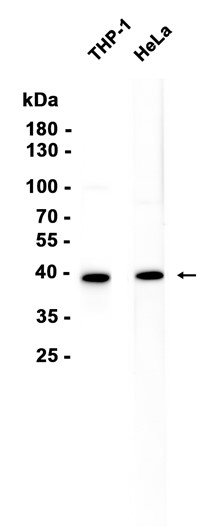 Western blot analysis of extracts from THP-1,HeLa cells using db16265 at 1:1000.