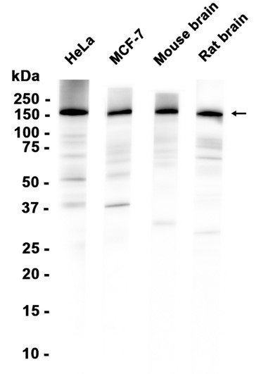 Western blot analysis of extracts from HeLa, MCF-7 cells and Mouse brain, Rat brain tissues using db16271 at 1:1000.