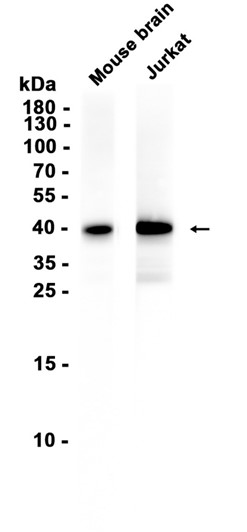 Western blot analysis of extracts from Mouse brain tissue and Jurkat cells using db16277 at 1:1000.