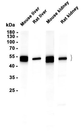 Western blot analysis of extracts from Mouse liver, Rat liver, Mouse kidney, Rat kidney tissues using db16318 at 1:1000.