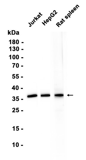 Western blot analysis of extracts from Jurkat, HepG2 cells and Rat spleen tissue using db16367 at 1:1000.