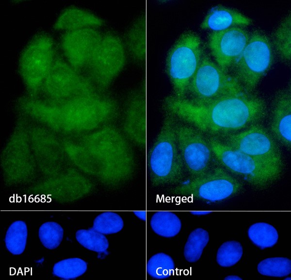 The cells were fixed with cold 100% methanol (10min, 4℃) and blocked in 1% BSA/10% normal goat serum/0.3M glycine in 0.1% PBS-Tween 20 for 1h. The cells were then incubate with db16685 (1:100) at room temprature for 1h, followed by a further incubation at room temperature for 45min with Goat Anti Rabbit lgG (H+L)-AF488 (