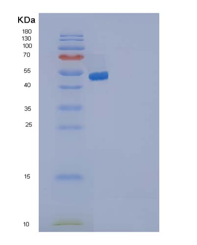 15% SDS PAGE(reduced) analysis of Recombinant Human IL18 / Interleukin 18 / IGIF Protein (GST tag)