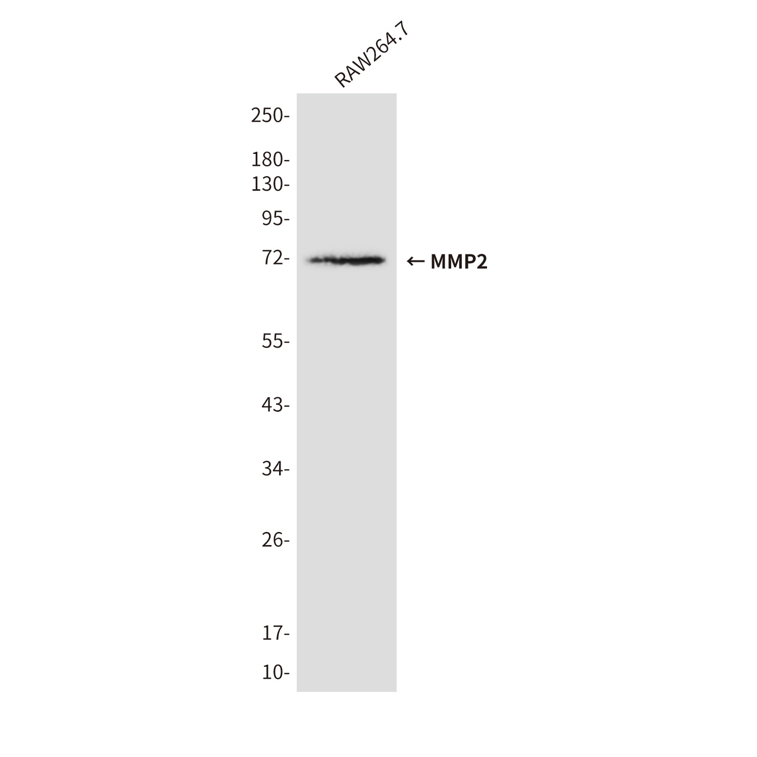 Western blot analysis of MMP2 (3A8) in Raw264.7 lysates using MMP2 antibody.