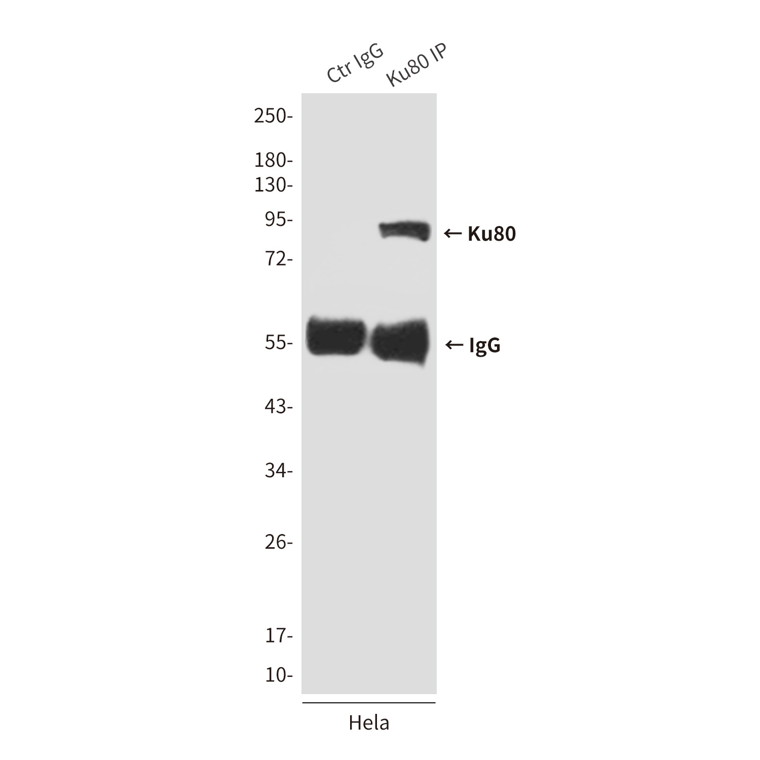 Immunoprecipitation analysis of Ku80 (8H1) in Hela lysates using Ku8 antibody.