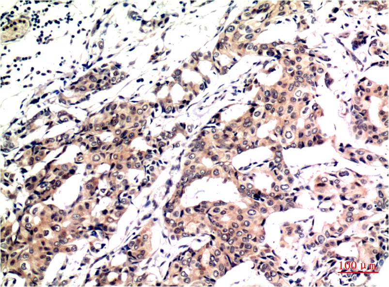 Immunohistochemistry analysis of paraffin-embedded Human Breast Carcinoma Tissue using Ubiquitin antibody.High-pressure and temperature Sodium Citrate pH 6.0 was used for antigen retrieval.