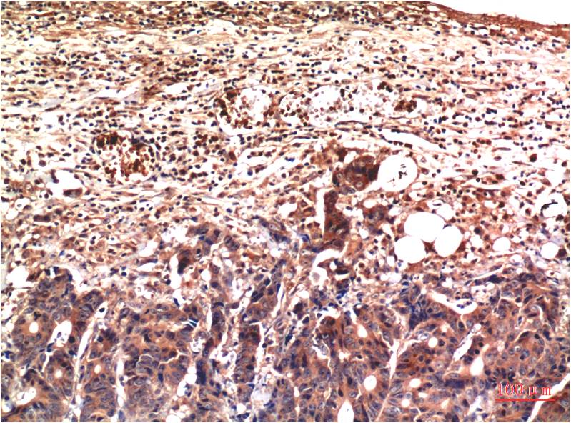 Immunohistochemistry analysis of paraffin-embedded Human Stomach Carcinoma Tissue using Ubiquitin antibody. High-pressure and temperature Sodium Citrate pH 6.0 was used for antigen retrieval.